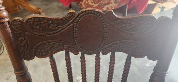 Unique beautiful child's carved rocking chair. I believe the wood is mahogany. Has all original parts and is sturdy. My grandchildren have all grown out of it. Bought at an Estate Sale in East San Diego County.