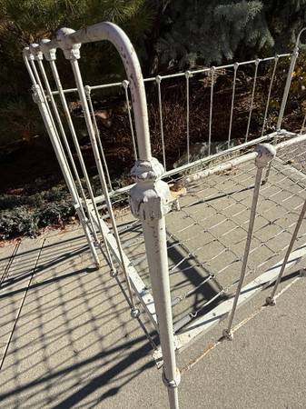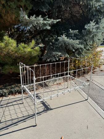 Rolling Antique Ornate Victorian Cast Iron Baby Bed/Crib with Springs. Rolls beautifully, feels solid. Would look fun with outdoor plants, store display or use inside to hold blankets/pillows, etc.! (Not to be used for it's original purpose, don't think it would quite pass safety standards for children now! Ha!) 37 1/2" t x 53 1/2" l x 29 1/4 d.