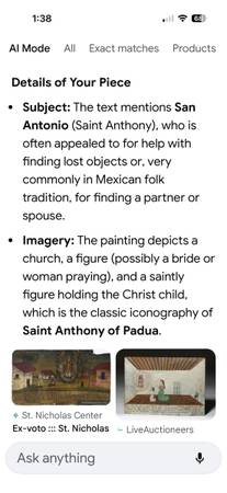 Vintage folk art. Hand painted on tin. Appears to tell the story of a bride thanking Saint Anthony for finding her husband, Jose. Signed by Maria Gonzales, Jan. 25, 1971. Would actually be interested if anybody knows more about Maria and Jose who may have just celebrated a wedding anniversary. Pick up in McCall or I pack & ship, $12