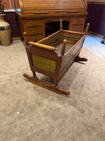 We are selling our med 1800s baby cradle. Cradle is all original with original milk paint. This was part of an estate of a plastic surgeon in California. we used it for years for firewood next to the fireplace and it looked great price is firm if anyone’s interested please contact Tom.