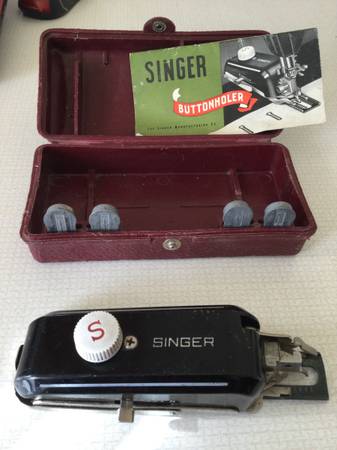 Vintage Singer 106743 Buttonholer Original maroon case, Manual and 4 templates For use on a 301 Slant shank machine Box shows a little wear, but closes snugly Made in the USA
