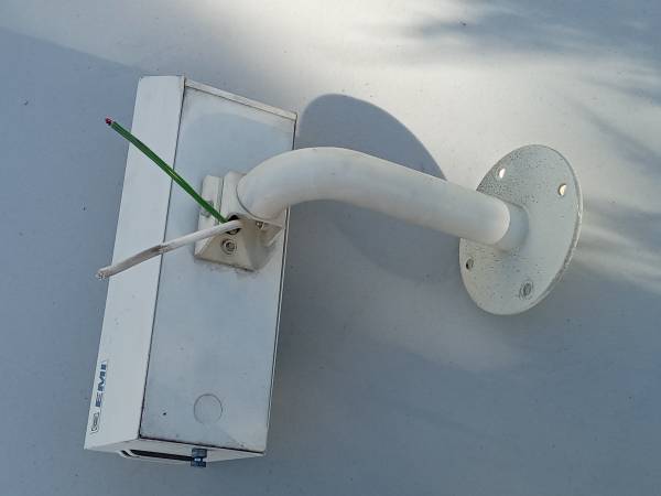 Vintage EMI Zero Outside CCTV Camera Housing Enclosure with Unknown Brand Camera Inside. Untested. Enclosure is roughly 13.5" long with hood by 4.75" tall by 4" wide