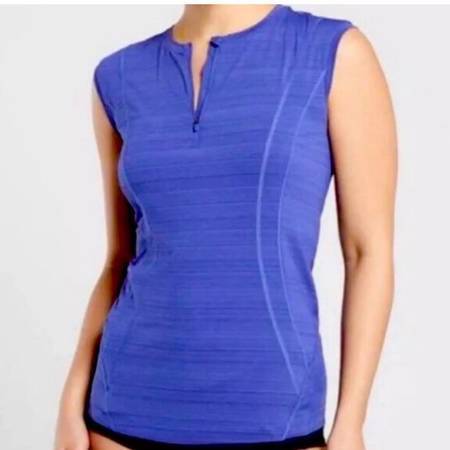 Ladies Size LARGE Blue, sleeveless ATHLETA Pacifica Illume Fitted Tank Top Full UPF Coverage Shirt. NEW W TAGS. 19.5" pit to pit. 27.5" height on back side. zippered pocket on front RIGHT side. stock photo incl. to show fit.*** Only $30.