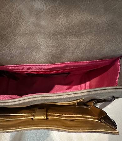 NWT Cross Body purse with total 4 pockets, 2 of them are zippered. spaces for 8 cards/ID/Dl. Golden inside front pocket, fuchsia pink inside main compartment. Cross body strap is removable/length adjustable. gray/ash color. never used. only $14 firm.