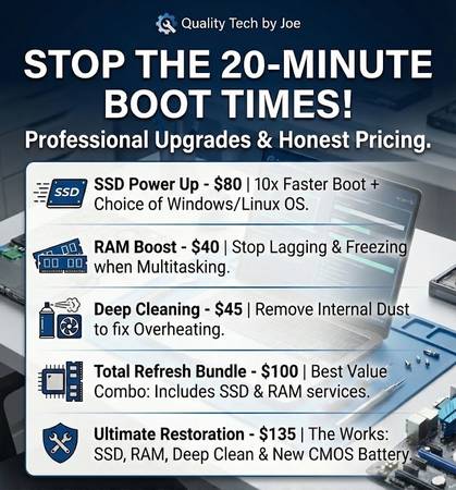 I am a local independent technician (Quality Tech by Joe) providing professional hardware upgrades with transparent, flat-rate labor pricing.