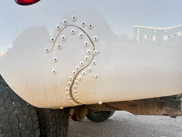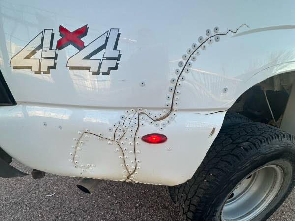 There are cosmetic fiberglass cracks on the passenger side dually fender from a slow turn in the past. The cracks were reinforced with rivets to prevent spreading. This is strictly cosmetic, very common on dually trucks, and does not affect how it drives or tows. Shown clearly in the photos.