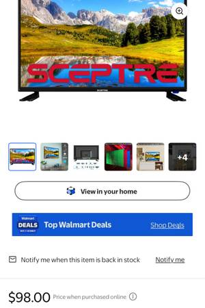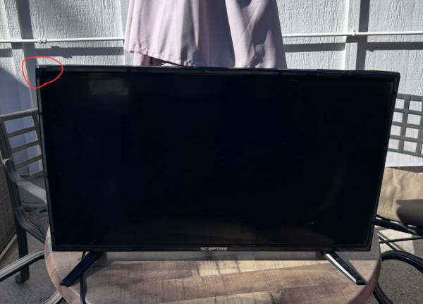 TV wall mount arm extension with free 33” Sceptre TV Corner plastic trim is cracked but taped and right side has lines down screen but works