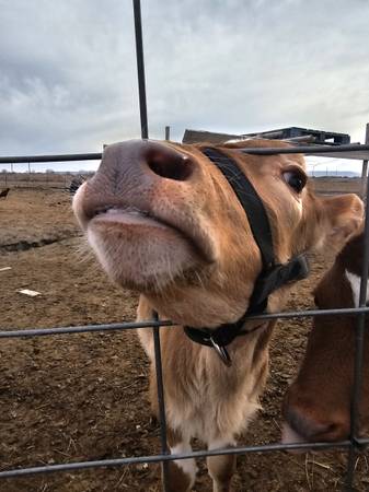 Guernsey bull pure bred. Multi min shot are done. Birth date 12/30. Eats grain and hay. Has been hand raised. Loves scratches, shy at first but is very sweet. His brother sucked on his ear so it’s swollen but no other concerns and its healing well. Healthy boy.