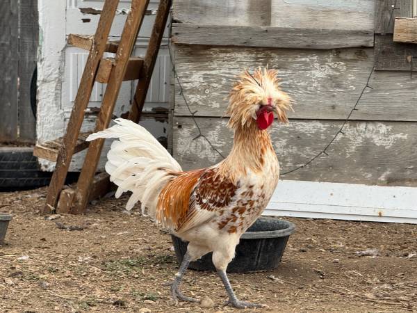 Young polish rooster hatched this spring. Located in Nampa near airport