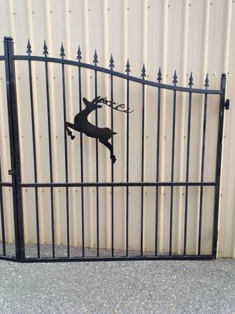 14' wrought iron bi-parting gate with jumping deer silhouette on each panel. These gates come with weld on leaf style hinges attached and are designed to be welded to a post or metal plate. It wouldn't be difficult to drill the hinge for bolt on applications. $450 OBO
