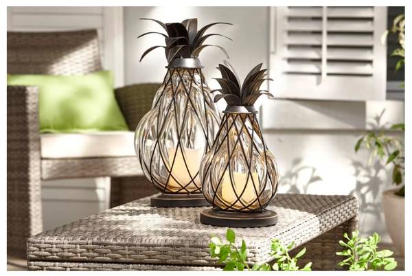 Aged bronze pineapple-style lanterns with LED candles. Made with clear mouth-blown glass for a premium look. Suitable for indoor or outdoor use. Great for patios, balconies, pathways, or as...