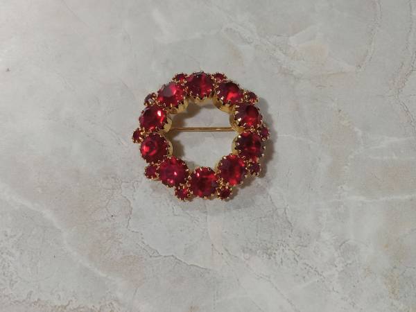 Vintage Signed WEISS Ruby Red Gold Tone Circle Brooch
