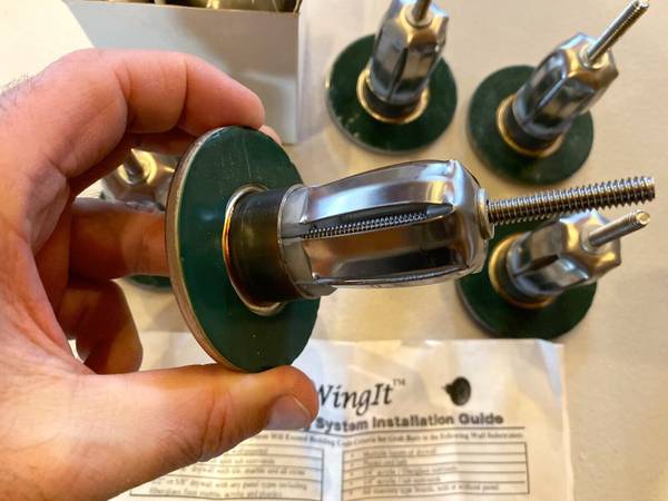 Lot of 2 new WingIts stainless steel anchor fasteners for ADA grab bar mounting or for problematic towel racks that get used instead of safety bars, or by rambunctious kids. Works well for tile shower installs where studs cannot be located or studs are in the wrong place. Easy to install by drilling a hole through the tile and concrete backer board and installing the WingIt and tightening the anchor screw which permanently expands the stainless steel rosebud behind the backer board and tile. A rubber sealing washer provides for a water tight seal. Provides a very strong safety grab bar anchor when installed, or use for childproof mounting for towel racks where they alway get pulled out of the wall:) by kids horsing around.