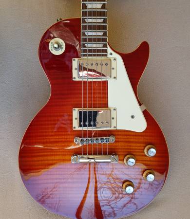 and Epiphones and this one plays, sounds and looks amazing. The finish is a gorgeous dark cherry sunburst with a flamed maple top. The body and neck are mahogany. Pickups are PAF style humbuckers with plenty warmth and clarity. Ive installed Grover Milk Bottle tuners and Gibson reflector knobs, both are upgrades.