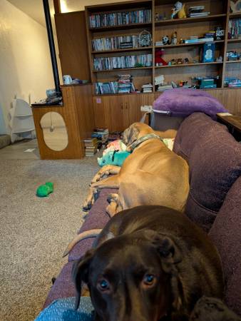 I just adopted a dog less than a week ago. The landlord however now says I cant keep him. He is a Mastiff. He walks decent on a leash.(Pulls a little) He warmed up quickly to my other dog but has chased my cats a little. He loves attention and cuddles. He does not seem to have separation anxiety. He is also potty trained, he will let you know when he needs to go outside. He is just a big goofy baby. There is a small rehoming fee. Please text (208)- four four seven-9353