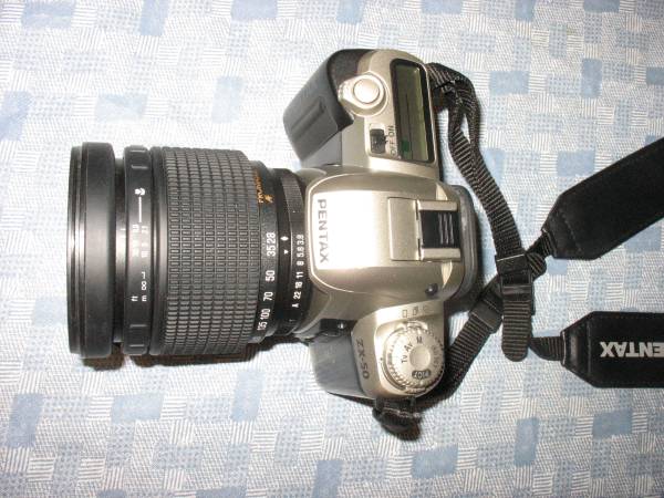 This Pentax ZX-50 camera comes with a 28-200mm lens and is in beautiful condition. It uses 35mm film and is working well. It can be used in full manual or automatic modes. Comes with Pentax case.