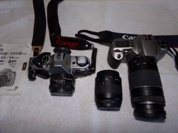 Canon AE1 with Canon lens FD50MM, Canon lens 35-80MM, Canon E05 Rebel XSN-Canon lens 75-300MM, carrying case, film, clean and in good condition. Phone calls only, I do not text. Call 208-870-965one...