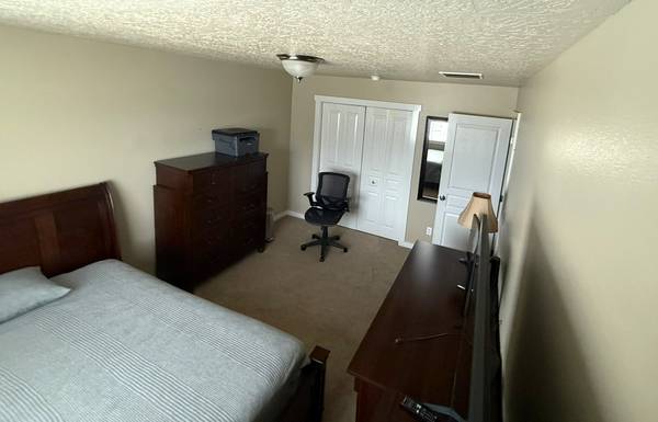 The room is 14'x10' with a 8'x2' closet and is fully-furnished. We aren't desperate on a timeline and can flex as needed for the right roommate. The bed is a queen, the TV is 65" and the closet is 8'x2'. We put mini fridges in this and other bedrooms to make sharing a fridge in the kitchen easier. This room is one of two bedrooms at the end of the upstairs hallway, with a bathroom in between that is shared with the other renter. Laundry is in the room between yours and the master bedroom, driveway has room for off-street parking, and we have shelves in the garage if you have need of space for things you don't want in your room - if you have questions, please ask.