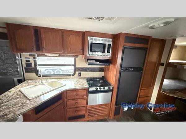 Perfect for the larger family, this Keystone Hideout 26BHSWE travel trailer features double bed bunks, a rear bath layout, pull-out exterior camp kitchen, and large single slide for added interior space.Before stepping inside check out the camp kitchen where you will find a mini refrigerator, single sink, two burner stove top, and storage. The perfect addition for any family to enjoy cooking and dining outside easily.On the inside you will also find a great kitchen for preparing and cooking food as you travel. There is a large pantry for storing dry goods, a 7 cu. ft. refrigerator, three burner range, and double kitchen sink making cleanup a snap.Across the room is a large slide out featuring a u-shaped dinette and tri-fold sofa with storage above, plus providing additional floor space when it is fully extended. The entertainment center is centrally located and can easily be viewed from any seating in the room.The front bedroom offers a queen size bed, dual bedside closets, and overhead storage, plus more.The rear of the unit offers a double bed set of bunks, and a rear corner bath which provides a tub/shower, toilet and sink.The front pass-through compartment allows you to easily stow away your larger camping gear, plus so much more!