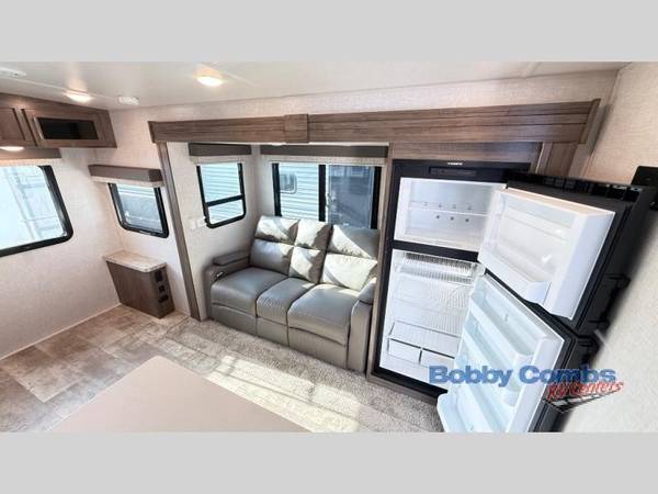 Whether you looking for breakfast nook-style seating, theater seats for movie nights or a spacious front bedroom, you will find it all in this trailer! The bar top with chairs and LED TV allow you to dine while enjoying your favorite show, and the 67" theater seats make watching movies more comfortable and fun. You can also relax on the hide-a-bed sofa and your guests will love sleeping here. The full bathroom has two entries which is super convenient, and the front bedroom gives you a slide out queen bed for more floor space, a wardrobe and more storage along the front wall.