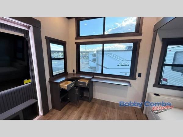 Hop on new adventures with the Forest River Cedar Creek Cottage Fifth Wheels! Each destination fifth wheel features a 101" wide body frame that provides a sturdy foundation for your adventures, while the AlphaPly TPO roof membrane offers superior durability and weather resistance. Plus, the 3M Bonded Sidewalls add an extra layer of protection and strength, and the hydraulic front jacks make setting up camp a breeze. In the luxurious interiors, the vinyl floor covering is easy to clean, and the Vixeinite flush floor slides in the kitchen and living area provide a seamless transition between the floor and the slide-outs. In addition, the 52" ceiling fan in the living room circulates air and adds to the spacious feel, and the kitchen island is a standout feature, boasting a solid surface counter, a flush-mount sink, and a stainless-steel design. You'll feel like you're cooking at home! Finally, the USB ports in the bathroom ensure you can keep your devices charged and within reach, even in the most convenient places.