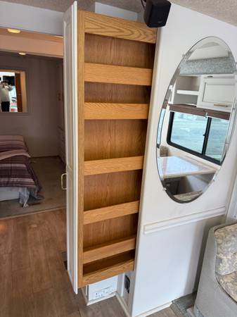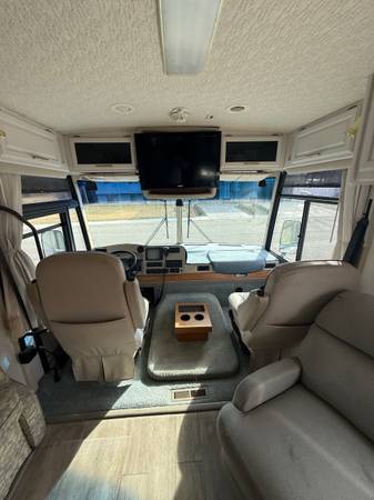 THIS IS A MODERN LOOKING COACH FOR A 2003. HAS A LARGE CENTRAL HEATING AND A/C UNIT NOT THE TYPICAL ROOF UNITS. THIS COACH HAS FULL SURROUND SOUND THROUGHOUT THE COACH, FLAT SCREEN TV’S, YOU CAN STREAM OR ITS EQUIPPED WITH A DOME SATELLITE FOR TIMES YOUR OUT OF CELL SERVICE RANGE. WATER PURIFIED LARGE FILTER SYSTEM, POWER AWNING WITH ALUMINUM PROTECTION CASING IN NEW CONDITION, AUTOMATIC LEVELING SYSTEM, UPGRADED LARGE CONVECTION/ MICROWAVE, LARGE FRIDGE/ FREEZER, DOUBLE SLIDE OUTS, 5000 WATT ON BOARD GENERATOR, NEW BEDDING. TIRES IN GREAT SHAPE, UPDATED WINDOW COVERINGS. JUST A GREAT COACH RUNS AND DRIVES AMAZING! THIS IS A CALIFORNIA COACH RUST FREE!!!