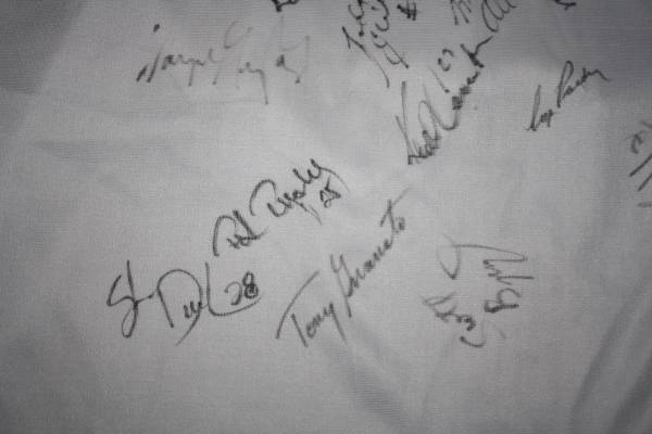 At this time the season ticket holder lot was next to the players parking lot, she obtained 100's of signatures over the years both L.A kings and opposing player's whose team bus also parked in Kings players lot. She made a very detailed schematic chart of all the players who signed this Jersey. As you can see most signatures are very legible. I have keep this Jersey in a dark place to keep signatures from fading.
