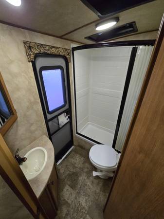2015 Crossroads Sunset Trail Lite 28' travel trailer in great condition. Dry weight 5535 lb, tandem axle, 2 slide outs, sleeps 8 queen bed, dinette folds down into bed, double over double bunks. Large bathroom with separate entry, propane or electric water heater, outside shower, 3 way fridge/freezer, central ducted heat and AC, power awning, large pass through storage. 2 5/16" ball