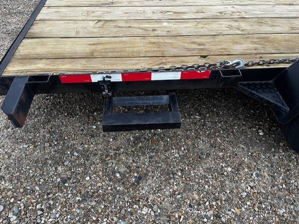 Purchased NEW Aug. 2021. 7,000 lb. GVWR. Used for occasional general light duty utility hauling. Never over its GVWR. Factory LED lights, brakes, ramps, EZ Lube hubs. 7' X 18' deck, 23' 4" OAL. D-rings & stake pockets. Comes with Tongue box, (due for paint; photo), and spare tire, (never used). One small dent in LH fender, (forklift loading). Deck was treated with preservative last summer. Tongue box needs new paint, (photo). Nice, not abused trailer for the money. Replies asking "Is it available" WILL NOT BE ANSWERED. If you're reading this, it's available. In person offers might be considered. NO message offers will be answered. Serious inquiries please email, call or text me. Selling to purchase a tilt deck for current needs.