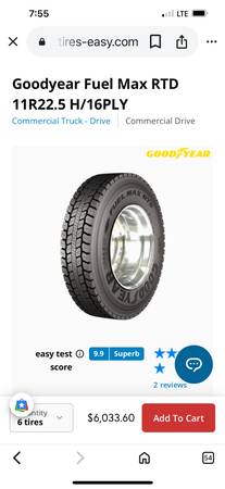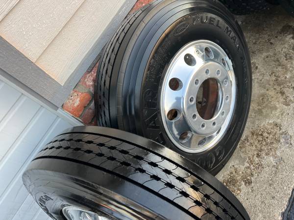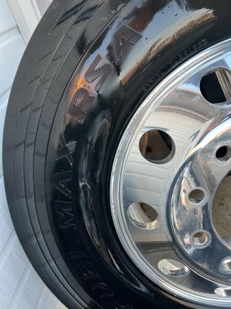The front steering tires are on the same Model Alcoa rims (882673db) but the tires are Goodyear Fuel Max RSA load level G. These are a very sought after tire due to their high quality and high mileage performance.